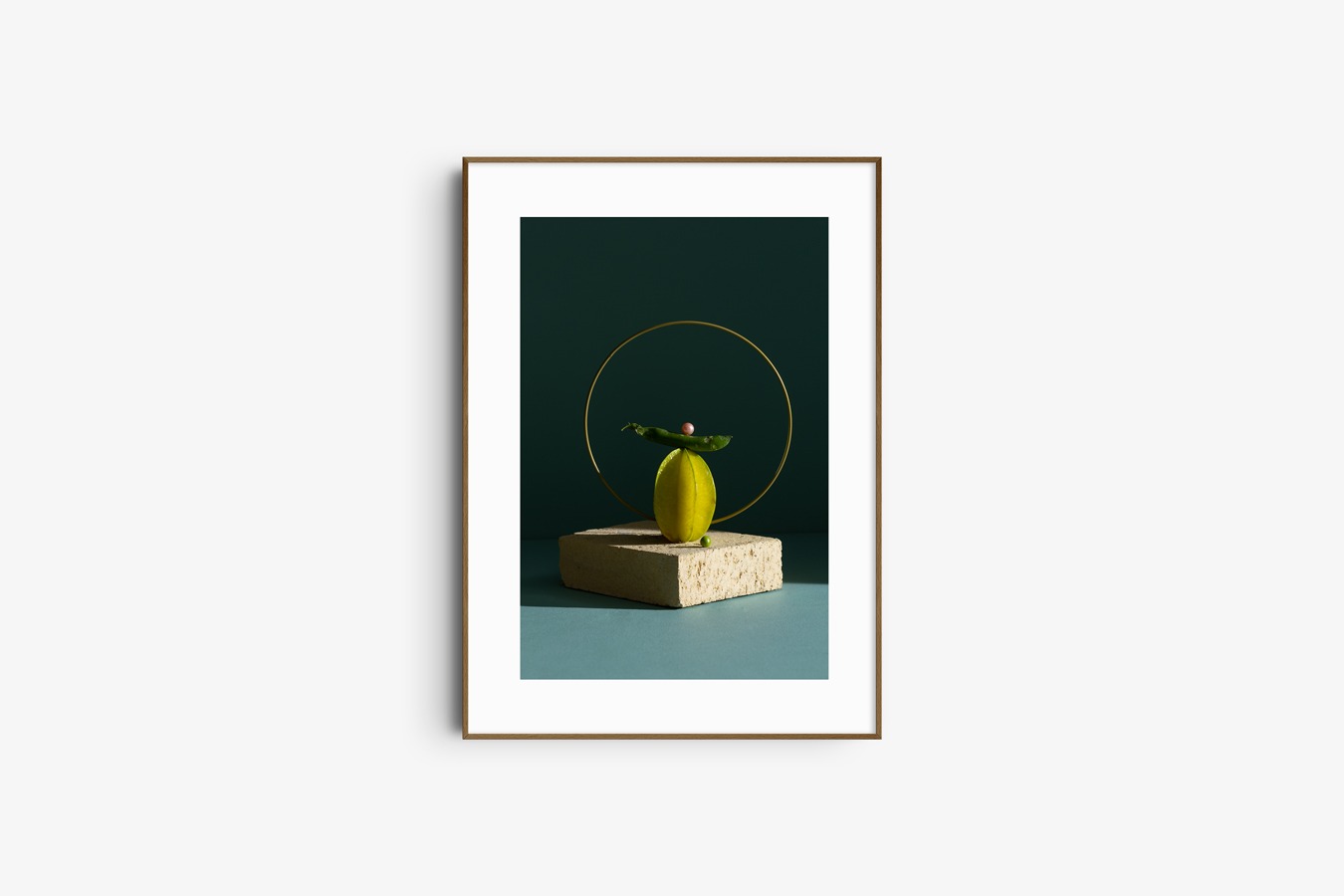 Who knew starfruit could be such a superstar? Stellar Balance is a playful still life that turns this tropical fruit into a cosmic work of art. Perfectly perched on a humble block, framed by a golden halo, and crowned with a cheeky little bead — it’s basically fruit royalty.